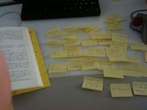 KJ法A型(もどき)をしてからマインドマップ(もどき)にしてみた。情報カードを買おうとしたら妻が「付箋のほうがいいよ、かさばらないし貼り付くし」というので付箋で。名刺サイズよりだいぶ小さい。まとめるまとめるまとめるマインドマップ用のクロッキーに並…